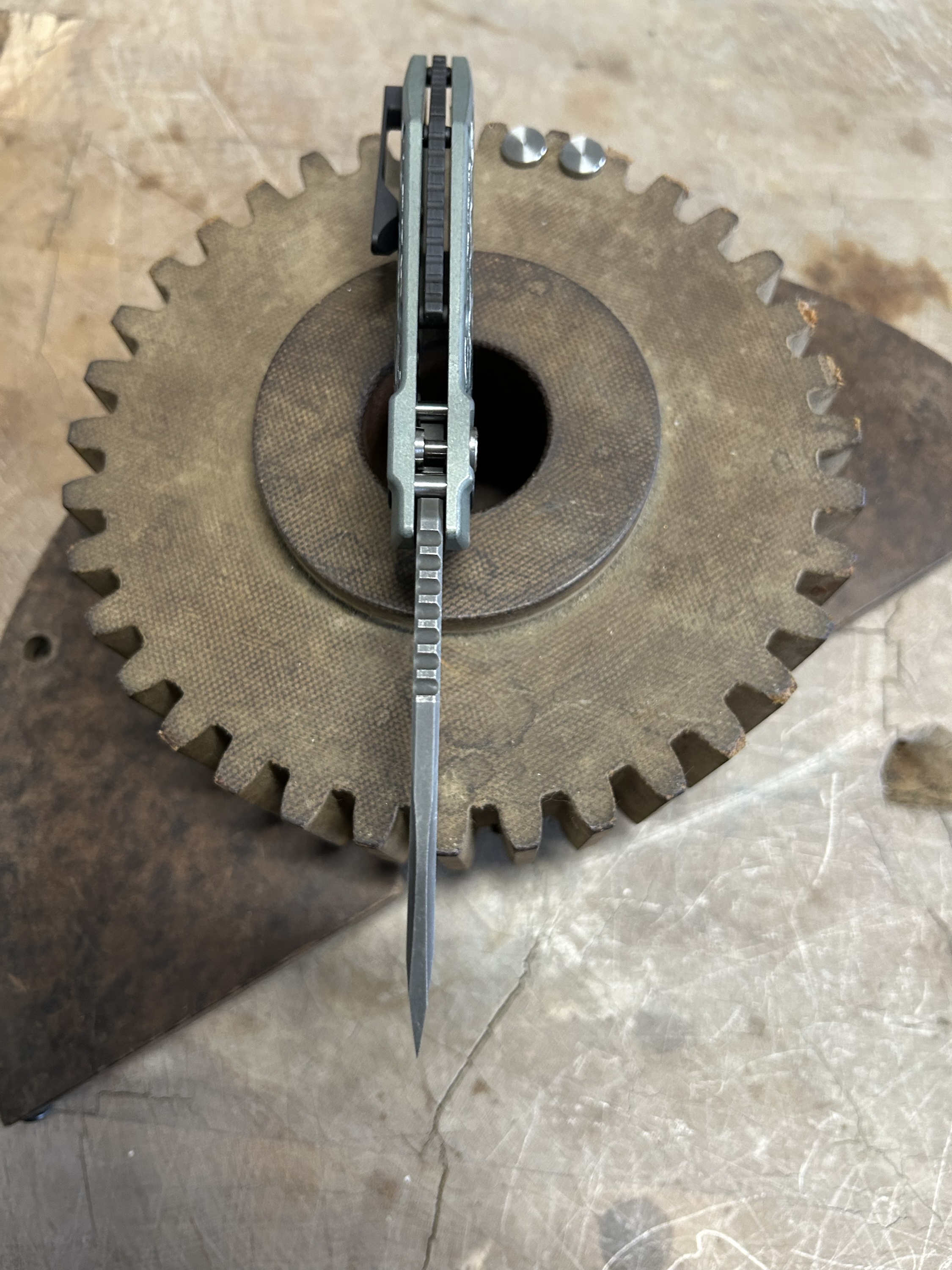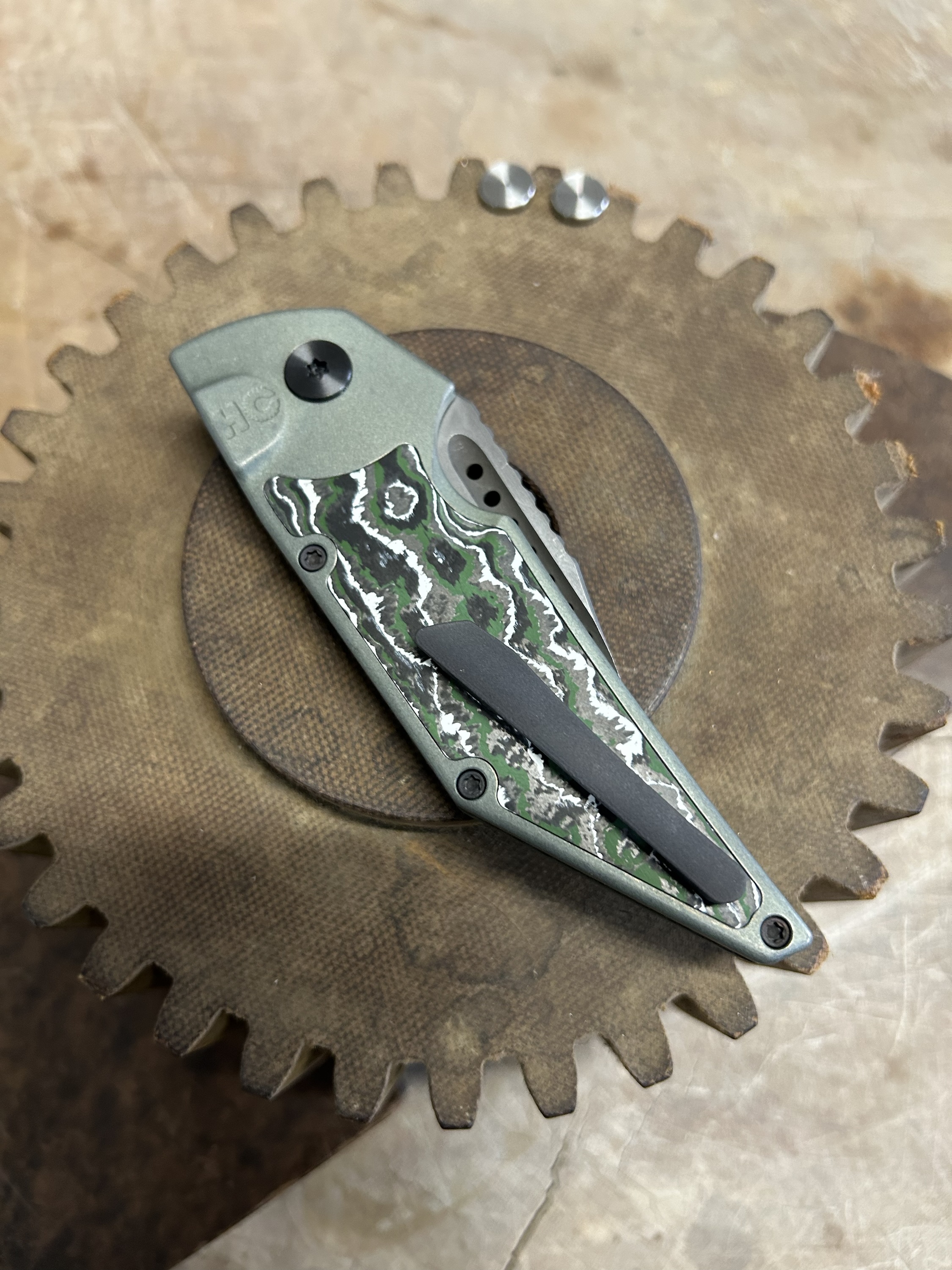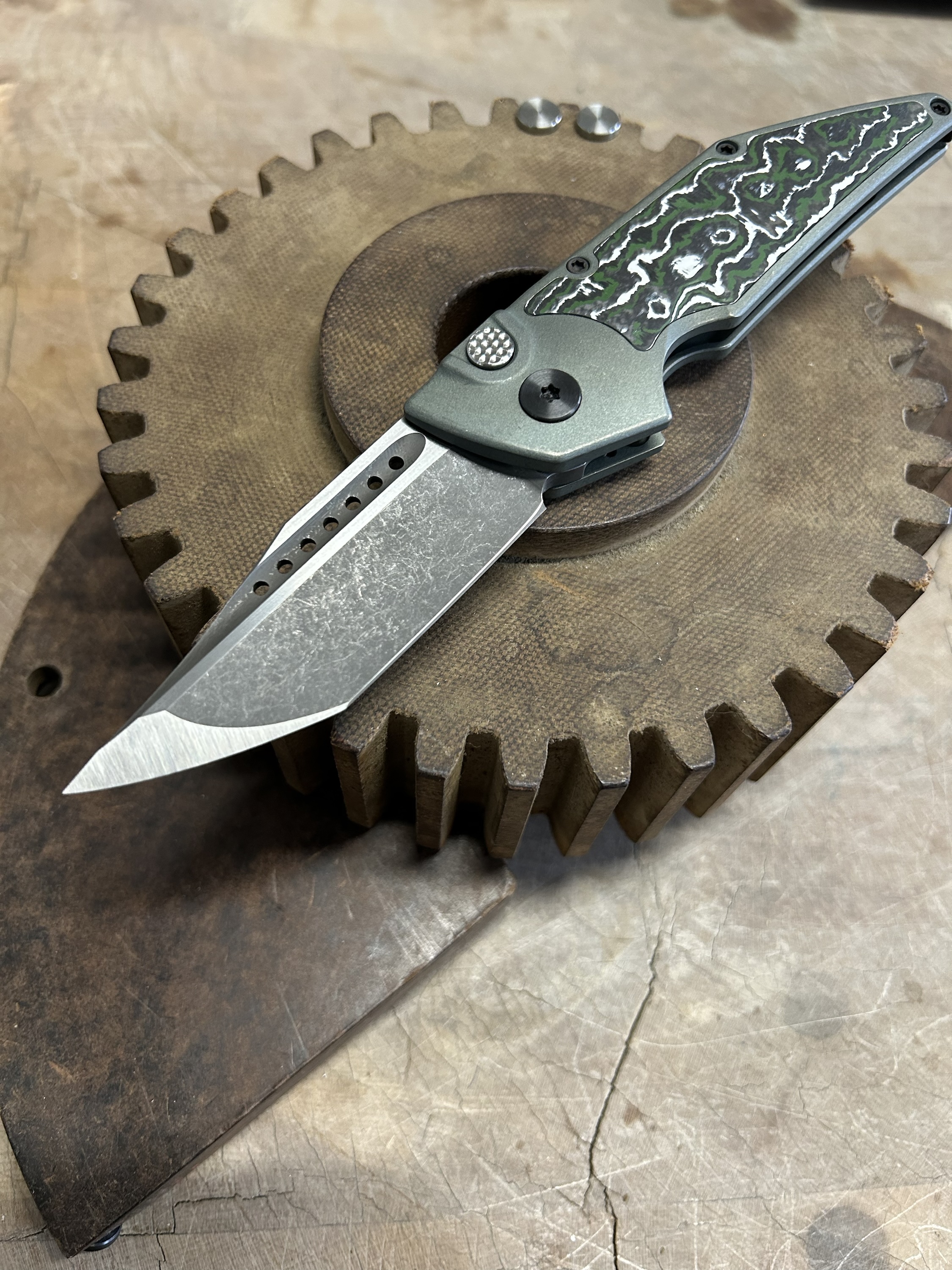 Dharma Automatic Serial #0016 Blade- S35VN Handle- Titanium Inlays- Fat Carbon Clip- Titanium Spacer- Titanium Pivot- Zirconium  3.2″ blade length 7.3 overall length